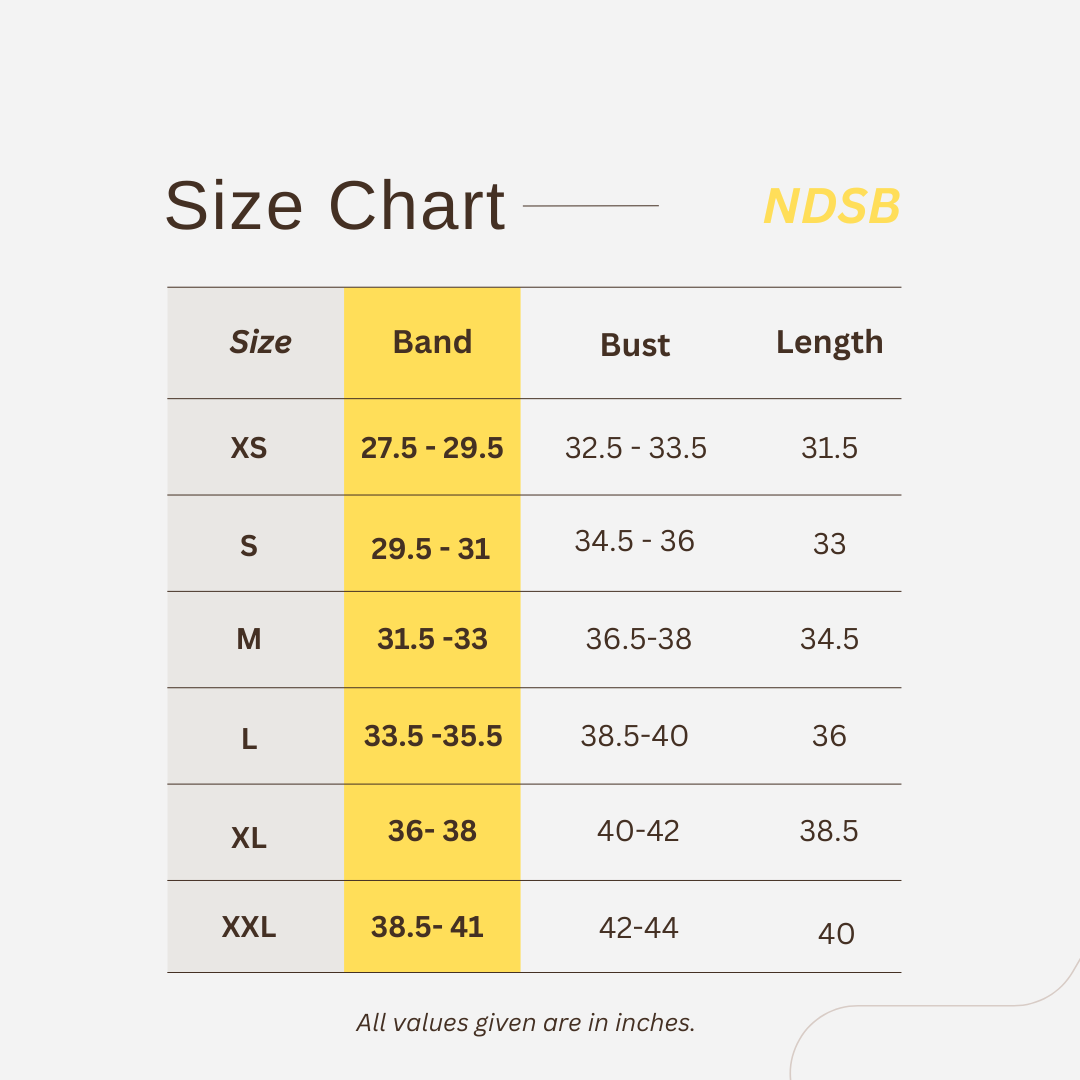 Use the sizing chart to match your bra band size (26-42) with an alpha bra size range (XS–XXL). A larger size will provide a slightly looser band fit. A smaller size will be slightly tighter. You decide what feels best.